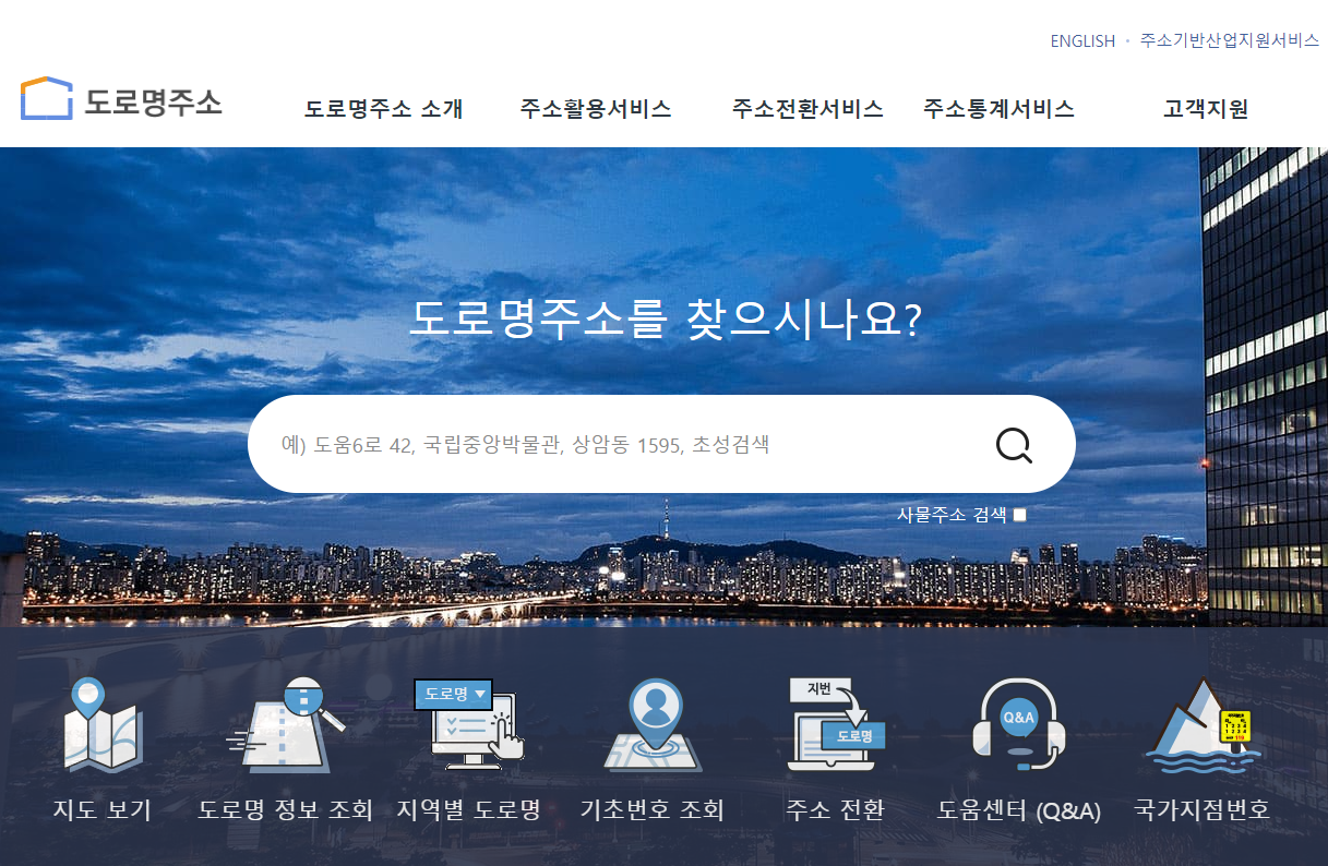 첫째, 아래 바로가기를 통해 도로명주소 검색 웹사이트에 접속합니다.